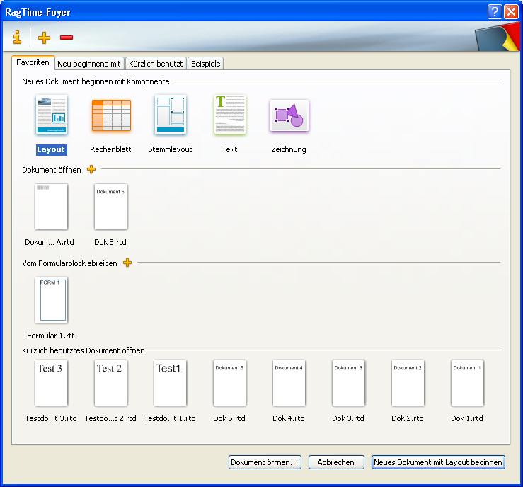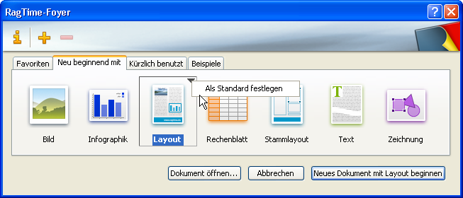Beim Start öffnet RagTime 7 das Foyer. Das ist in der Voreinstellung so festgelegt. Aber wie so vieles bei RagTime lässt sich das individuell anders einstellen. Auch wer lieber mit einer leeren Layoutseite starten will – wie von RagTime 5 gewohnt – braucht auf den Komfort des Foyers nicht zu verzichten. Mit Klick auf das Symbol