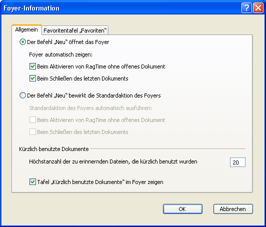 Ist in der Tafel «Allgemein» (siehe Abb. 1.2) der erste Radioknopf aktiv (in der Voreinstellung ist er das), dann startet RagTime mit dem Foyer. Ist dagegen der zweite Knopf aktiv, dann startet RagTime mit einer frei wählbaren «Standardaktion» – mehr darüber etwas später.