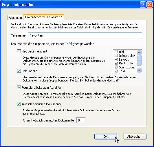 In der Gruppe «Neu beginnend mit» lässt sich auswählen, welche Komponentenarten für das Anlegen eines neuen Dokumentes in der Tafel «Favoriten» zur Auswahl stehen sollen. Wenn Sie neue Dokumente praktisch immer mit einem Layout beginnen, können Sie hier auch das Häkchen für die ganze Gruppe löschen – in der separaten Tafel stehen die übrigen Komponentenarten trotzdem immer zur Verfügung. Die Bedeutung der anderen Häkchen bei «Dokumente» und «Formularblöcke zum Abreißen» sind in der Foyer-Tafel erläutert.