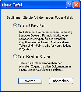 Arbeiten Sie an mehreren Projekten mit projektspezifischen Formularen und eigenen, häufig benutzten Dokumenten? Dann ist es zweckmäßig, für jedes Projekt eine eigene Foyer-Tafel zu definieren. Klicken Sie auf