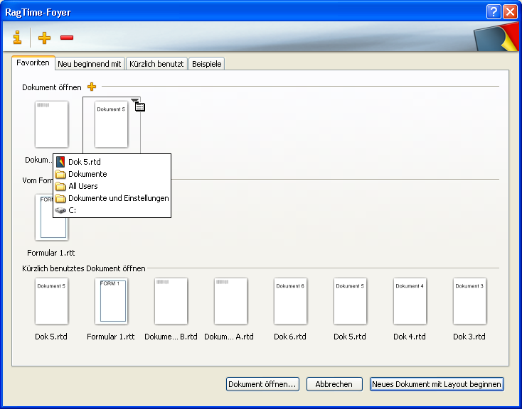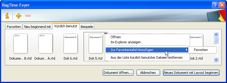 in der Kopfleiste des Foyerfensters und fügen Sie für jedes Projekt eine eigene Favoriten-Tafel dazu. Sind alle Dokumente des Projektes in einem Ordner abgelegt, so können Sie auch diesen Projektordner zu einer eigenen Foyer-Tafel machen, in welcher dann alle im jeweiligen Ordner enthaltenen Dokumente angezeigt werden, die mit RagTime geöffnet werden können. RagTime-Dokumente haben eine Vorschau, Dokumente von anderen Programmen haben keine Vorschaumöglichkeit. Ob Ordner oder Favoritentafel wählen Sie im Fenster, das nach dem Klick auf