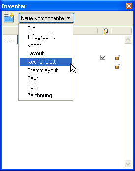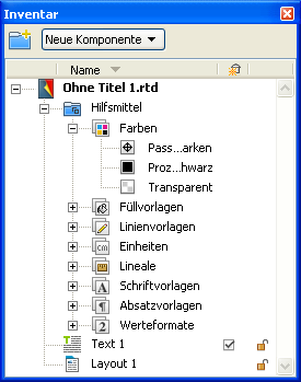Wird sie dagegen mittels des Menübefehls «Fenster ➝ Neue Komponente» oder mittels des Einblendmenüs im Inventar erzeugt, so fehlt das Häkchen. Klar, denn sonst würde sie ja gleich wieder gelöscht, da sie ja noch nirgends verwendet wird. Es kann sich also lohnen, beim Erarbeiten eines neuen Dokumentes die Häkchen bei allen neuen Komponenten sofort wegzuklicken.