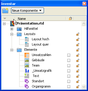 Um im Inventar die Übersicht zu behalten, sollten Sie unbedingt alle Vorlagen und Komponenten mit eigenen, beschreibenden Namen versehen (siehe Abb. 1.11). Ohne Zuordnung von klaren und besonders für Sie selbst merkbaren Namen werden komplexe Projekte rasch unübersichtlich. Das Arbeiten mit Formeln und Berechnungen unter Einbezug mehrerer Komponenten führt ohne Benennung ins Chaos. Die Gliederung in Ordner würde es zwar erlauben, den selben Namen mehrfach zu vergeben, also z. B. den Namen «Text» für Komponenten in mehreren Ordnern zu verwenden. Vermeiden Sie aber identische Namen – auch für Ordner und Komponenten! Zu groß ist die Wahrscheinlichkeit, dass Sie sich selbst verwirren – und auch RagTime streikt, wenn ein doppelt vergebener Name in einer Formel verwendet wird.