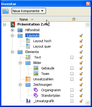 So kann z. B. ein Layout mit allen darauf verwendeten Komponenten in einem Ordner gesammelt werden. Oder es lassen sich Ordner für bestimmte Komponentenarten bilden.