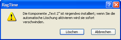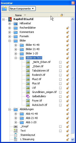 Ein Beispiel: Sie haben auf einer Layoutseite eine Komponente, sagen wir einen Text, bei der das Ankreuzfeld im Inventar mit √ markiert ist. Nun löschen Sie im Layout den Rahmen, der diese Komponente enthält – oder gleich die ganze Layoutseite. Die besagte Textkomponente wird augenblicklich aus dem Inventar verschwinden und ist damit im Dokument nicht mehr vorhanden. Wäre im Inventar das Häkchen der Textkomponente gelöscht gewesen, so wäre diese bei Ihrer Löschoperation im Inventar stehen geblieben, also im Dokument immer noch vorhanden. Hier heißt es aufpassen! RagTime kann nur einen einzigen Schritt rückgängig machen. Die Wahrscheinlichkeit ist groß, dass eine derartige automatische Löschung einer Komponente erst nach einem weiteren Schritt bemerkt wird. Dann ist diese aber unwiederbringlich gelöscht und damit möglicherweise wertvolle Arbeit zunichte gemacht. Wenn Sie es noch rechtzeitig bemerken, besteht die einzige Rettungsmöglichkeit darin, das Dokument ohne Sichern zu schließen und neu zu öffnen. – Automatisch gelöscht wird eine Komponente aber nur, wenn sie im Dokument an keiner anderen Stelle – z. B. in einem anderen Layout – ein weiteres Mal verwendet wird. Eine Referenz in einer Formel reicht nicht!