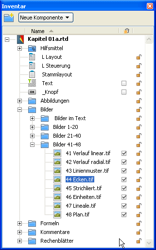 Es lohnt sich also, diese Häkchen im Inventar zu beachten. Erzeugen Sie eine neue Komponente innerhalb einer anderen Komponente, z. B. durch Einfügen auf einer Layoutseite, so erscheint diese Komponente im Inventar automatisch mit Häkchen.