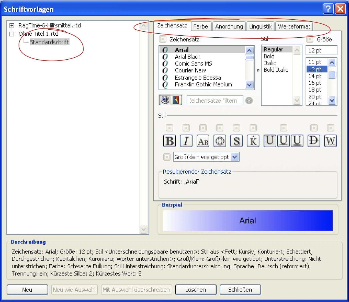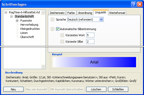 RagTime bietet die Vorlage «Standardschrift» zweimal an. Einmal unter «RagTime-6-Hilfsmittel» und einmal für das gerade aktive Dokument (siehe Abb. 1.15 oben links). Im ersten Fall gilt die Formatierung der Standardschrift für alle RagTime-Dokumente, die Sie in Zukunft öffnen werden. Im zweiten Fall gilt sie logischerweise nur für das betreffende Dokument. Die Vorlage «Standardschrift» lässt sich übrigens nicht löschen und sie sollte auch nicht umbenannt werden – obwohl dies möglich ist –, da bei gewissen Operationen das Vorhandensein dieser Vorlage vorausgesetzt, und bei deren Fehlen eine neue mit diesem Namen erzeugt wird.