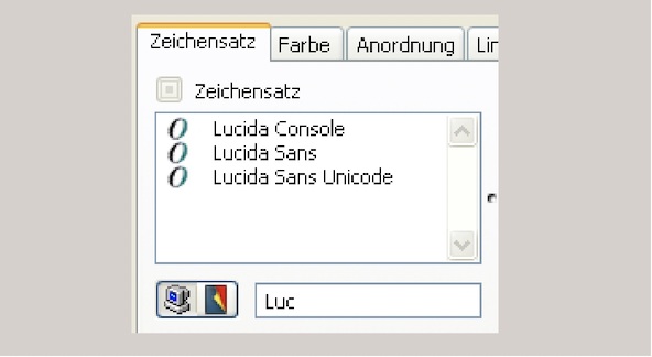 Auf der Tafel «Zeichensatz» wählen Sie aus Ihren geladenen Schriften diejenige aus, die Sie in Ihren Dokumenten allgemein verwenden wollen. Dabei können Sie links unterhalb der Liste mit den beiden Symbolen auswählen, welche Schriftenliste angezeigt werden soll, entweder alle im Computer installierten Schriften, oder nur die im Dokument bereits verwendeten. Im Feld rechts von diesen Symbolen können Sie den Anfang eines Schriftnamens eingeben, z. B. «Luc» für «Lucida» – wobei aber das Computersymbol aktiviert sein muss, um unter allen installierten Schriften zu suchen. So werden in der Liste nur die verfügbaren Lucida-Schriften aufgeführt. Jetzt können Sie die Vorlage auswählen und dieser die gefundene Schrift zuweisen (siehe Abb. 1.16).