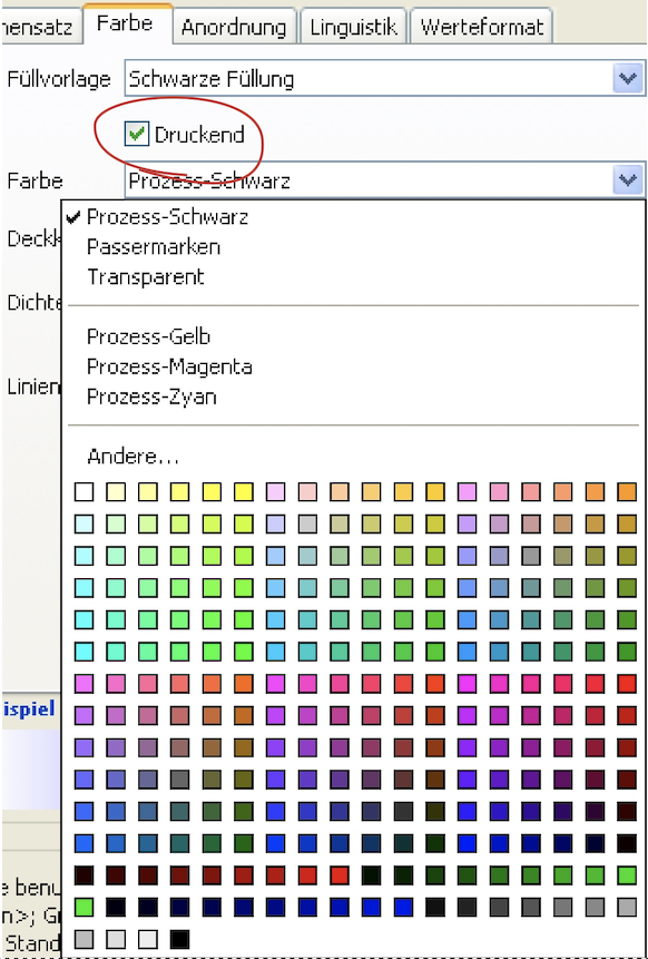 Erstellen Sie aber besser zuerst mit dieser Farbe eine Farb- und eine Füllvorlage. Wie schon erwähnt, ist nur mit einer disziplinierten Vorlagenstruktur eine nachträgliche Änderung im ganzen Dokument einfach und schnell möglich. – Hier ist es vor allem wichtig, dass das Häkchen bei «Druckend» gesetzt ist. Sonst kann die schönste Farbe auf dem besten Farbdrucker nicht erscheinen. Nichtdruckend, also ohne Häkchen, bleibt die Schrift nur auf dem Bildschirm sichtbar, was für Erläuterungen in Formularen sehr sinnvoll sein kann.