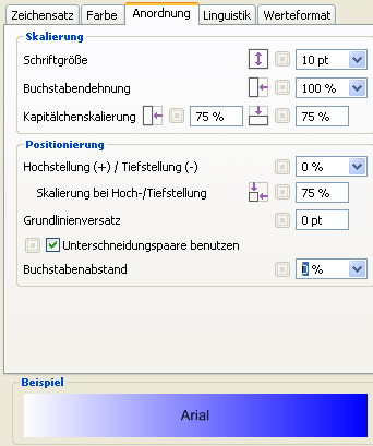 Mit der Tafel «Anordnung» (Abb. 1.19) können Sie noch einmal die Schriftgröße – auch im Zusammenhang mit der Dehnung und anderen Faktoren – einstellen. Theoretisch lassen sich hier die wildesten Buchstabenverfremdungen produzieren, die jedem Typografen die Nackenhaare hochstellen. Verwenden Sie Buchstabendehnung und -stauchung nur mit größter Zurückhaltung! In der Praxis wichtiger, besonders bei Formelsatz und wissenschaftlichen Texten, ist die Hoch-/Tiefstellung und der Grundlinienversatz.