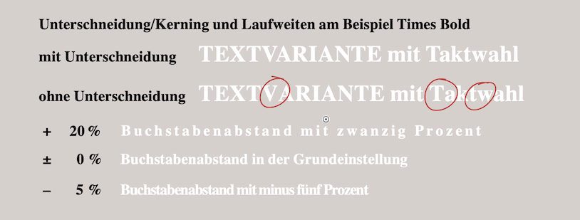 Auf die Grundlinien gehen wir im Abschnitt 1.5.5 „Die fixe Grundlinie“ näher ein. Die Eigenschaft «Unterschneidungspaare benutzen» sollte grundsätzlich aktiviert sein. Sie verhilft Ihrem Text zu einem ausgeglicheneren Schriftbild, indem die sonst zu großen Abstände zwischen A, L, T, V oder W und den nachfolgenden Buchstaben verkleinert werden, z. B. bei Kombinationen wie «VA», «Ta» oder «tw» (siehe Abb. 1.20). Der Buchstabenabstand verändert die Laufweite der Schrift, also die Zwischenräume zwischen den einzelnen Zeichen, nicht aber deren Breite. Eine von 0 abweichende Vorgabe führt also zu gesperrtem oder verengtem Text. Der Typograf spricht von Spationierung, Kerning und/oder Unterschneidung (siehe Abb. 1.20 unten).