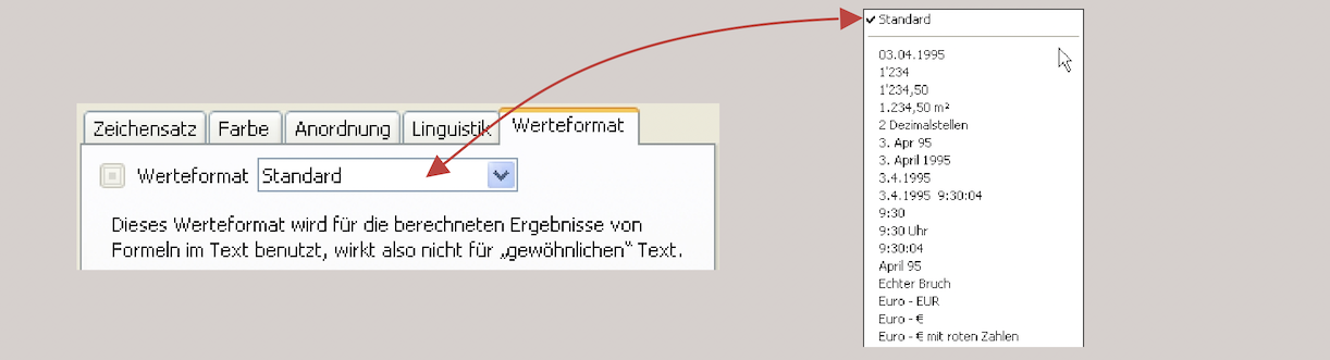 Unter «Werteformat» behalten Sie am besten die «Standard»-Einstellung, es sei denn für ganz spezielle Anwendungen. Beispielsweise bei Schriftvorlagen, die für Finanzthemen verwendet werden, könnte anstelle von «Standard» auch «Euro – €» die richtige Wahl sein. Wie auf der Tafel erläutert, sind die Werteformate einer Schriftvorlage nur für «berechneten Text» gültig. Aber gerade in einem Jahresbericht – als klassisches Beispiel – werden die Zahlen im Text typisch mit Referenzen aus Rechenblättern geholt (sind also berechnete Texte), damit Text und Tabellen sicher übereinstimmen. Diese Möglichkeit ist eine der großen Stärken von RagTime.