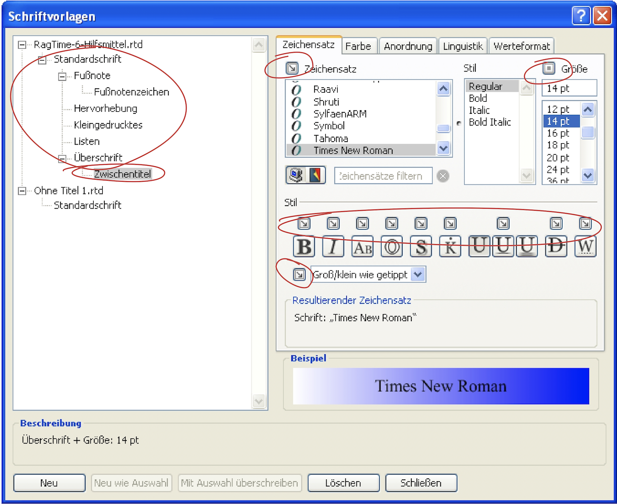 Im neu installierten RagTime gibt es nur eine einzige Schriftvorlage für Überschriften, beruhend auf «Times New Roman». Sie möchten für die Zwischentitel Ihres Textes zwar die gleiche Schrift haben, aber in einem kleineren Schriftgrad? Dann aktivieren Sie im Verzeichnis links die Vorlage «Überschrift» und drücken die Taste «Neu» unten. Es entsteht, eingerückt unter «Überschrift» eine neue Vorlage, und Sie brauchen nur deren Namen zu ändern, z. B. auf «Zwischentitel», und die Schriftgröße anzupassen (siehe Abb. 1.23).