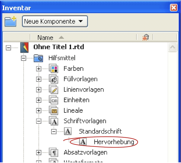 Kehren wir für einen Moment zurück zum Inventar. Haben Sie für ein Dokument Vorlagen definiert, so werden diese im Hilfsmittel-Ordner des Inventars in der entsprechenden Rubrik aufgeführt. So lange Sie in einem Dokument lediglich mit der Standardschrift gearbeitet haben, wird dort nur diese Vorlage angezeigt.