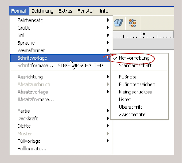 Ordnen Sie aber einem Text eine weitere Vorlage aus dem Hilfsmittel-Dokument zu (z. B. Textstelle auswählen «Format ➝ Schriftvorlage ➝ Hervorhebung»), so erscheint diese Vorlage sofort auch im Inventar des Dokumentes (siehe Abb. 1.24). Gleichzeitig wird sie im Einblendmenü oberhalb statt unterhalb des Striches dargestellt (siehe Abb. 1.25). Beachten Sie, dass bei dieser Vorlagenübernahme das Erben dominiert. Gesetzt also den Fall, dass der Standardschrift-Vorlage unter «RagTime-6-Hilfsmittel» und der Standardschrift-Vorlage in Ihrem aktuellen Dokument verschiedene Schriften zugeordnet sind, so wird die Übernahme der Vorlage «Hervorhebung» nicht etwa die ausgewählte Textstelle mit der „Hilfsmittel-Standardschrift“ anzeigen, sondern mit der «Standardschrift» des aktuellen Dokumentes. Deshalb ist es so wichtig, auch die Erbabhängigkeiten richtig zu definieren.