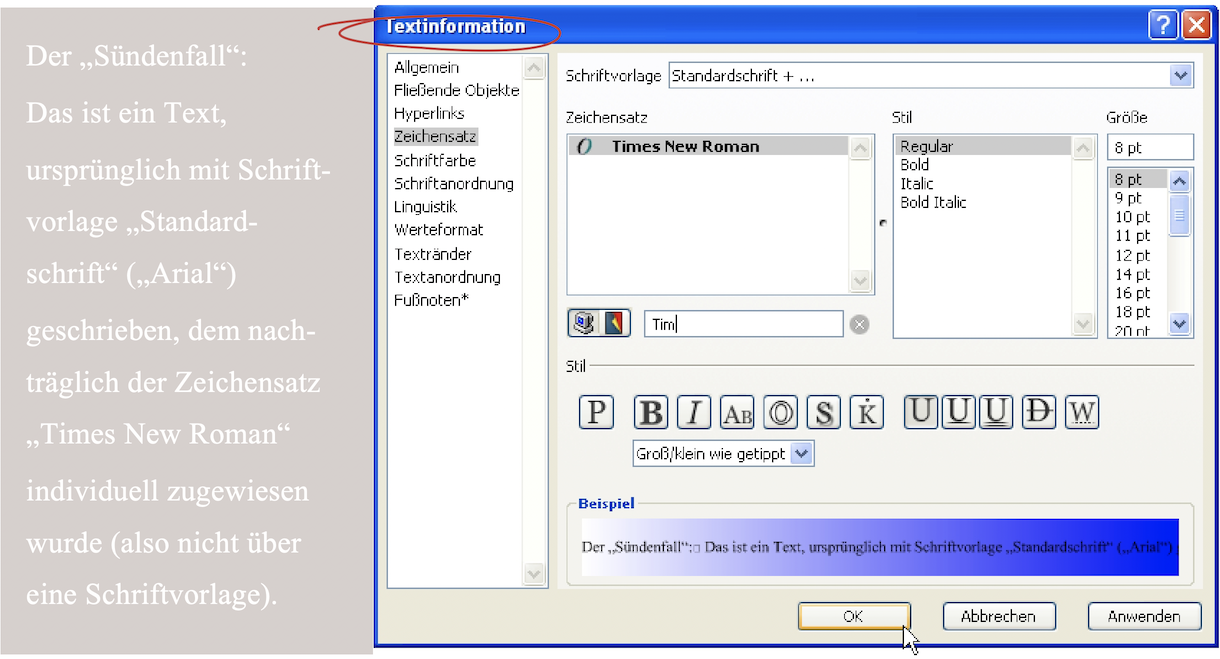 Was Sie aber in der «Schriftinformation» ändern, wird für den ausgewählten Text als Abweichung von der Schriftvorlage gespeichert. Beim Verändern der Schriftvorlage bleiben solche, separat bestimmten Schriftcharakteristika erhalten. Das führt oft zu Missverständnissen. Darum noch einmal: Verwenden Sie vorzugsweise immer Schriftvorlagen.