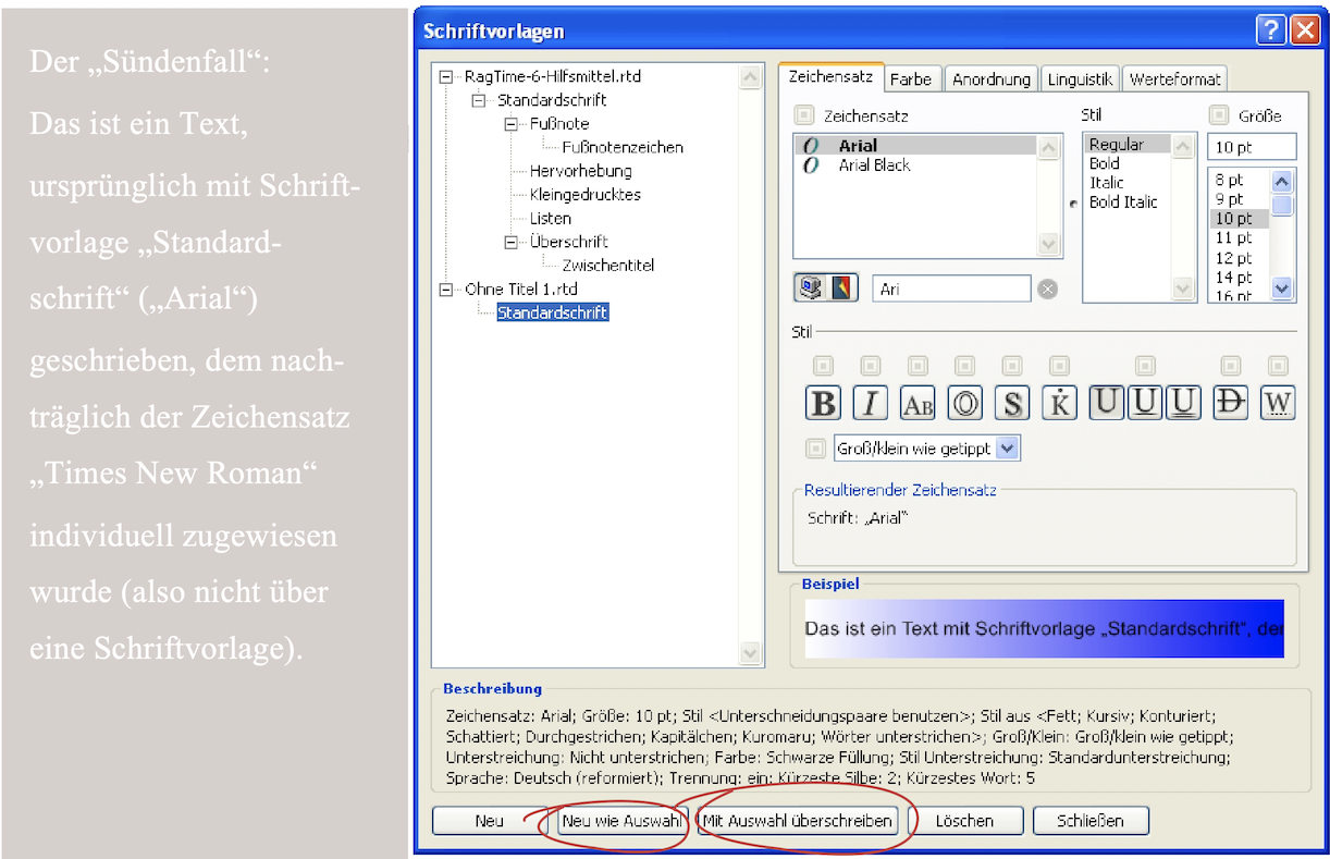 Aber RagTime 7 vergibt Ihnen Ihre Sünde! Sie können die individuelle Schriftformatierung auch im Nachhinein ganz einfach in eine „ordentliche“ Schriftvorlage überführen: Wählen Sie die Textstelle mit Überstreichen oder Mehrfachklick aus, oder klicken Sie irgendwo in den individuell formatierten Text. Dann öffnen Sie das Einstellungsfenster für Schriftvorlagen (z. B. mit «Fenster ➝ Hilfsmittel ➝ Schriftvorlagen»). Mit dem Knopf «Mit Auswahl überschreiben» übernehmen Sie die gemachten Einstellungen als Änderung der Vorlage, die der ausgewählten Textstelle zugeordnet ist (siehe Abb. 1.27).
