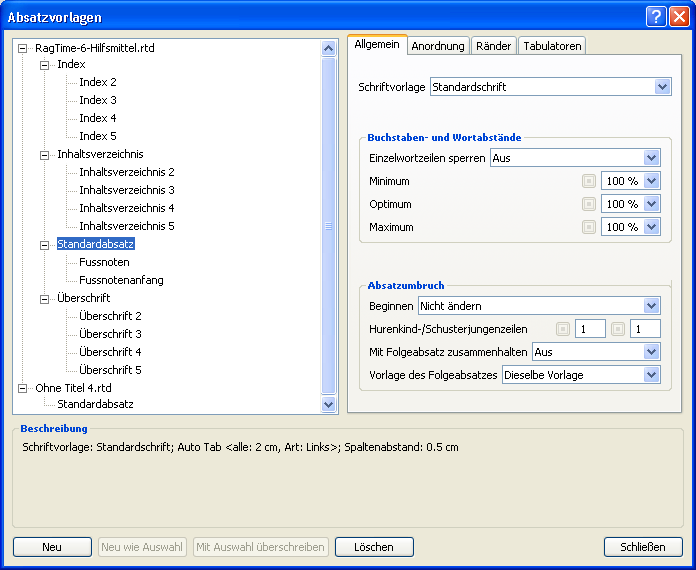 Die Absatzvorlagen beziehen alle Einstellungen mit ein, welche das Aussehen des gesamten Textes (über das Schriftbild hinaus) beeinflussen. Also Eigenschaften wie beispielsweise Block- oder Flattersatz, Einzüge, Tabulatoren, Zeilenabstände, Grundlinienraster usw. Die Tafel «Absatzvorlagen» (Abb. Abb. 1.28) zeigt unter «Allgemein» die vordefinierten Vorlagen in RagTime («Hilfsmittel») sowie die Standardvorlage für das Dokument («Ohne Titel»).