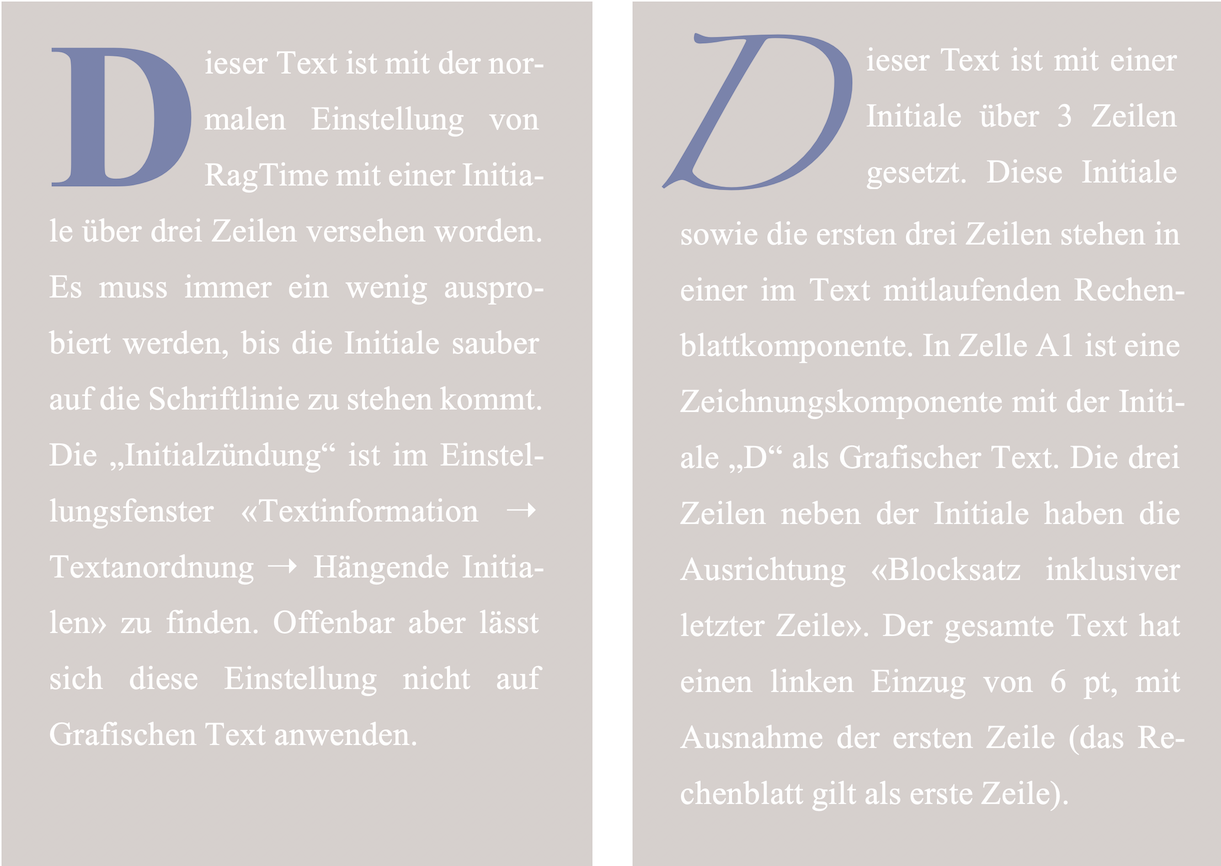 In einigen Texten, vor allem in Belletristik, können Initialen (mehrere Zeilen hohe Anfangsbuchstaben) sehr reizvoll sein. Der Umgang mit Initialen in den Absatzformaten von RagTime 7 ist allerdings nicht gerade das Gelbe vom Ei. Es braucht ein paar ruhige Minuten, um ein befriedigendes Resultat zu erzielen. Je nach Schrift ist das Ausrichten auf die Schriftlinie und auf die linke Satzachse recht knifflig. Auch lässt sich die Initiale in der Absatzvorlage nicht getrennt formatieren, das muss anschließend jeweils manuell erfolgen. Das in Abb. 1.29 links erstellte Initialenbeispiel ist dennoch mit den „bordeigenen“ Mitteln von RagTime erstellt, dasjenige rechts besteht aus einem mitfließenden Rechenblattrahmen (mit der Initale in A1 und den ersten drei Zeilen in A2. Absatzvorlage: Erste Zeile (entspricht dem Rechenblattrahmen) ohne Einzug, übrige Zeilen mit Einzug.