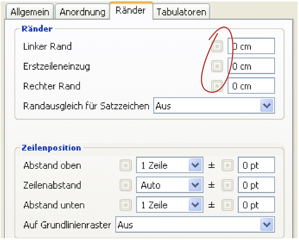 Die nächsten Einstellungsmöglichkeiten der «Absatzvorlagen» finden sich in der Tafel «Ränder». Unter «Ränder» sind Abstände zum Textcontainer zu definieren; in der Regel werden dies Einzüge sein, die für bestimmte Absätze gewünscht sind. Der «Erstzeileneinzug» ist absolut zu verstehen, nicht etwa relativ zum linken Rand. Eine Vorlage für Aufzählungen kann also beispielsweise einen Einzug 0 für die erste Zeile sowie 1 cm für den linken Rand haben. In der ersten Zeile steht dann implizite eine Tabulatorposition beim linken Rand. Diese ist aber im Textlineal unsichtbar – sie wird nicht angezeigt.