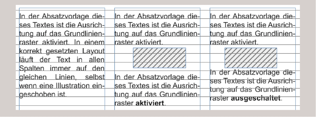 Die Option «Auf Grundlinienraster» einzuschalten ist immer dann sinnvoll, wenn Sie mehrere Spalten nebeneinander verwenden und dabei erreichen wollen, dass die Zeilen in allen Spalten auch nach eingefügten Illustrationen exakt auf gleicher Höhe stehen. Im vorliegenden Buch, wie in fast allen normal gesetzten Büchern, ist das der Fall (der Drucker oder Typograf spricht von „Register halten“).