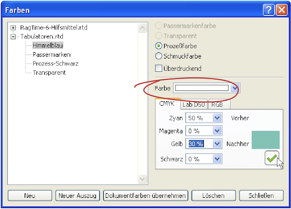 Wir setzen der Einfachheit halber voraus, dass bestimmte Farben schon zum voraus definiert sind. An dieser Stelle zeigen wir nur auf, wie Farben im Zusammenhang mit Schriftvorlagen einzusetzen sind. (Über Farbdefinition und das ganze Thema Farben, Farbräume, Farbmanagement in RagTime 7 siehe Abschnitt „Sind Farbräume bewohnbar?“ ff.)