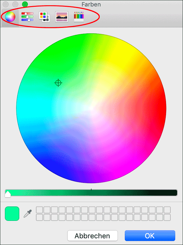 Auf dem Mac kann in einer Werkzeugleiste gleich zwischen mehreren solcher Werkzeuge ausgelesen oder mit der Lupe die Farbe eines beliebigen Punktes im Layout, auch in einem Bild, übernommen werden. Je nach gewähltem Werkzeug stehen weitere Optionen zur Verfügung.
