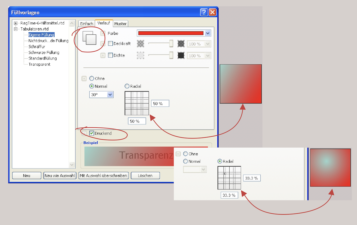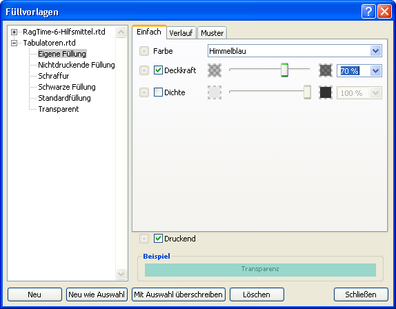 Fast scheint es, als würde hier „doppelt genäht.“ Füllvorlagen übernehmen oft nur eine eben definierte Farbe. Da aber bei einzelnen Formatierungen nur Füllvorlagen und keine Farbvorlagen aufgerufen werden können, ist dieser „Umweg“ nötig. Für Füllungen lässt sich aber zusätzlich auch die Transparenz (bei RagTime «Deckkraft» genannt) und die «Dichte» (Helligkeit) vorgeben, in Schritten von 10% mit dem Einblendmenü, feiner mit dem Schieber oder numerisch. Unten lässt sich außerdem einstellen, ob Flächen mit dieser Füllvorlage überhaupt gedruckt werden sollen oder nicht. Nichtdruckende Füllungen finden für Kommentare und deren Hinterlegung Anwendung, die nur auf dem Bildschirm interessieren, nicht aber im Druck.