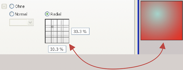 Verläufe können linear («Normal») oder «Radial» angeordnet werden. Bei linearem Verlauf kann der Winkel der Verlaufsrichtung angegeben werden. Bei 0° verläuft die Farbe von links (Vordergrund) nach rechts (Hintergrund). Der angegebene Winkel gibt die Rotation im Uhrzeigersinn an (siehe Abb. 1.39) Bei radialem Verlauf lässt sich die Position des Zentrums (Vordergrund) innerhalb der gefüllten Fläche in Prozenten der Objektdimensionen festlegen (siehe Abb. 1.40). In der Rubrik «Muster» kann eines der vorgegebenen Standardmuster ausgewählt werden. Im Quadrat rechts – oder auf den Befehl «Anderes…» in einem separaten Fenster – können Sie das Muster ändern, Pixel für Pixel. Allerdings lässt sich die Wiederholrate nicht ändern. Das Muster ist auf die Fläche des Quadrats beschränkt. Muster und Verlauf lassen sich nicht kombinieren.