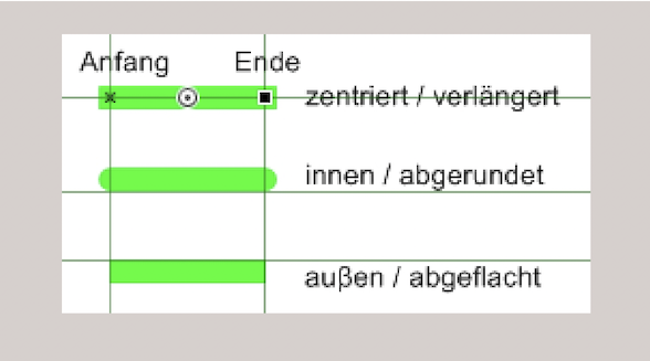 Was sofort auffällt: Um die Farbe einer Linie vorzugeben muss eine Füllvorlage ausgewählt werden. Im Gegensatz zu Linien in Zeichnungen oder im Layout kann eine Farbe oder Farbvorlage nicht direkt zugeordnet werden. Das zwingt Sie, sich an die Disziplin zu halten und systematisch zuerst eine Farbvorlage, darauf basierend eine Füllvorlage, und schließlich eine Linienvorlage zu definieren. Die Position der Linie ist nicht nur für den Rand von Objekten relevant, wie eigentlich anzunehmen wäre, sondern legt die ganze Linienbreite auch bei einfachen Linien links oder rechts von der Linienachse. – Mit «Abgeflachten Enden» reicht eine Linie genau vom Anfang zum Ende der Linie. Sie haben richtig gelesen: Linien haben einen Anfang und ein Ende. Das ist nicht nur bei der Zuordnung von Pfeilspitzen von Bedeutung, sondern auch bei der Angabe der Koordinaten. Mit «Abgerundeten Enden» oder «Verlängerten Enden» reichen Linien um die halbe Linienbreite über die Endpunkte hinaus (siehe Abb. 1.41).