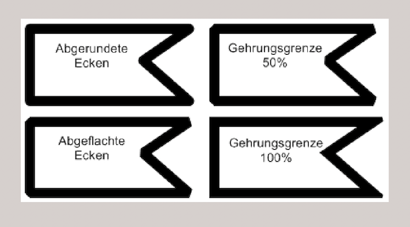 Die Ecken sind für Polygonzüge und alle Rahmen von Bedeutung. «Abgeflacht» und «Abgerundet» entsprechen den Erwartungen. Mit «Gehrungsecken» und einer «Gehrungsgrenze» von 100% – das ist die Voreinstellung – sind die Ecken spitz. Sollten Sie spezielle Wünsche haben, so experimentieren Sie mit der Prozentangabe für die «Gehrungsgrenze» einer sehr breiten Linie, z. B. 30 pt (siehe Abb. 1.42). So wird die Auswirkung einer bestimmten Vorgabe am ehesten erkennbar.