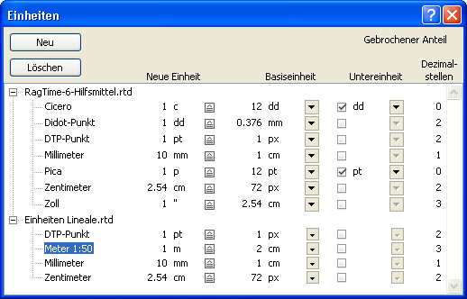 Eine Planskizze im Maßstab 1:50 möchten wir am liebsten so anlegen, dass die Maße alle in Metern angegeben und auch abgelesen werden können. Dafür muss eine neue Einheit definiert werden. Nennen wir diese „Meter 1:50“. Logisch scheint folgende Eingabe, die auf den bereits vorhandenen Einheiten aufbaut: «1 m» für die «Neue Einheit», die einer «Basiseinheit» von «2 cm» entsprechen, eben 1:50. Eine Untereinheit wird nicht benötigt. Damit wirklich präzise Eingaben, auch unter 1 cm real, möglich sind, werden 3 Dezimalstellen für den gebrochenen Anteil benötigt (siehe Abb. 1.44).
