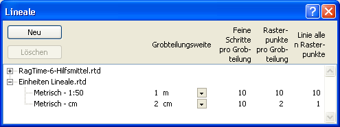 Basierend auf dieser Einheit lässt sich auch ein Lineal definieren. Nennen wir das neue Lineal «Metrisch – 1:50» (siehe Abb. 1.45). Die «Grobteilungsweite» beträgt natürlich «1 m». Diese Vorgabe bestimmt die im Layoutlineal und allen Koordinatenangaben angezeigten Zahlen. Die Vorgabe für «Feine Schritte pro Grobteilung» betrifft die Anzahl angezeigter kleiner Striche zwischen den ganzen Einheiten im Layoutlineal. Allerdings kann diese Anzahl je nach Darstellungsmaßstab auch geringer als die Vorgabe ausfallen. Je nachdem wie präzise Sie zeichnen wollen, sollten Sie die Vorgabe für die Anzahl Rasterpunkte machen. In unserem Beispiel wird mit der Vorgabe «10» alle 10 cm ein Rasterpunkt zu liegen kommen, also alle 2 mm im Plan bei einem Darstellungsmaßstab von 100%. Wenn Sie mehr Rasterpunkte angeben, dann wird das Positionieren heikel, weil es eine zu große Treffsicherheit erfordert. Außer Sie wählen beim Zeichnen einen größeren Darstellungsmaßstab.