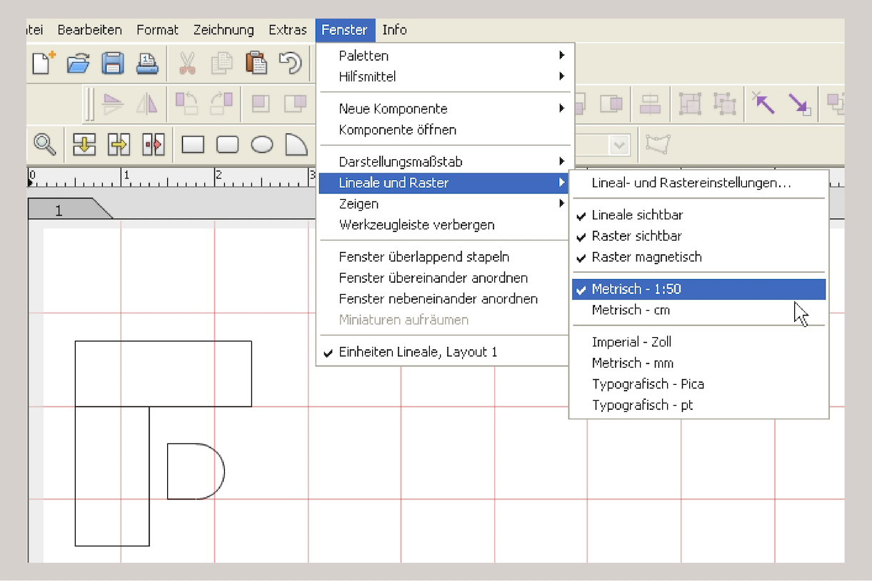 Hier ein kurzer Sprung zur Zeichenarbeit mit den Vorgaben, wie sie oben ausgeführt wurden, also im Maßstab 1:50. Damit diese Vorgaben zum Tragen kommen, müssen Sie im Dokument unter «Fenster ➝ Lineale und Raster» die Sichtbarkeit von Linealen und Raster einschalten und auch «Raster magnetisch» aktivieren. Natürlich muss das eben definierte Lineal ausgewählt sein. Wenn Sie die Objektkoordinatenpalette geöffnet hatten, so müssen Sie diese schließen und erneut öffnen, damit dort die richtige Maßeinheit angezeigt wird. Achtung: Wenn Sie ganz oben im Aufklappmenü den Punkt «Lineal- und Rastereinstellungen…» wählen, öffnet sich ein neues Fenster. In diesem können Sie – sogar getrennt für horizontal und vertikal – unter den definierten Linealen auslesen sowie die Sichtbarkeit und den Magnetismus für die beiden Achsen separat aktivieren. Vom Zweck her etwas unklar, weil nicht mit einem Titel versehen, sind die Maßangaben in den beiden Eingabefeldern ganz unten. Sie bestimmen eine Verschiebung des Raster-Nullpunktes (Ursprung) vom Blatt- oder Zeichnungsrand.