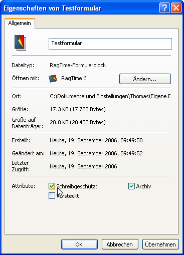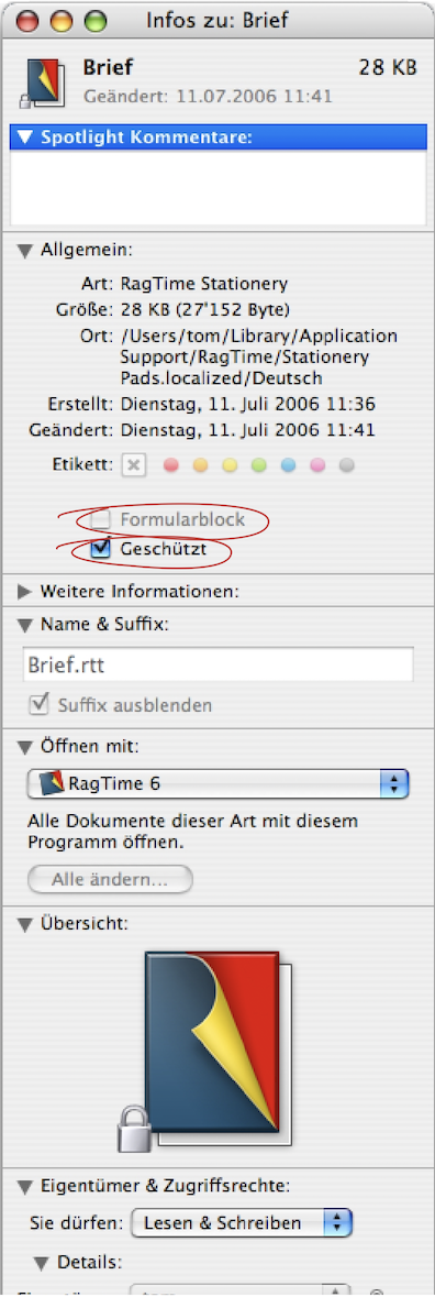 macOS bietet in der Dateiinformation (siehe Abb. 1.47) ebenfalls die Möglichkeit an, ein Dokument als Formularblock zu bezeichnen. Davon darf auf keinen Fall Gebrauch gemacht werden! Dagegen muss das Dokument geschützt werden. Achtung: Wenn das Formular ein anderes RagTime-Dokument referiert, so muss auch dieses auf dem Server liegen und in gleicher Weise geschützt werden. Nur so können alle im Netzwerk angeschlossenen Benützer auf das Formular zugreifen, ohne miteinander in Konflikt zu geraten. Aber auch in Netzwerken mit Windows-Rechnern ist der Grundsatz zu beachten, dass Formulare in RagTime als Formularblock gespeichert und die Blöcke auf dem Server geschützt werden müssen (siehe Abb. 1.48 und Abb. 1.49).