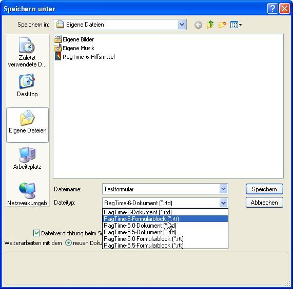 In einer Gruppe sollten möglichst alle die gleichen Formulare benützen. Also werden die Formulare in diesem Fall sowieso auf einen Server gelegt. Bei Mac-Netzwerken muss besonders aufgepasst werden. Einerseits müssen die Formulare unbedingt in RagTime als Formularblock gespeichert werden. Also ist das entsprechende Ankreuzfeld im Sichern-Dialog zu markieren. RagTime-Formulare erhalten so automatisch die Endung «rtt».
