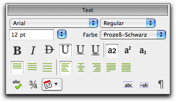 Die Einstellmöglichkeiten für Zeilendurchschuss und Ausrichtung sind vollständig vorhanden. Zuunterst stehen links je ein Auslösetaster für die Rechtschreibprüfung und das Einfügen von Symbolen sowie ein Einblendmenü für Sondertexte zur Verfügung. Mit den Schaltern rechts kann die Anzeige der Grundlinien, von berechneten Texten und der Sonderzeichen ein- und ausgeschaltet werden.