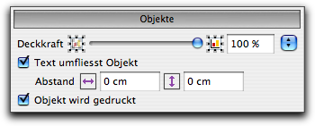 Dieser Sektor (siehe Abb. 1.52) macht ein paar wichtige Objekteigenschaften direkt zugänglich: Deckkraft (Transparenz), das Umfließen durch Text, samt den dazugehörenden Abständen, und das Drucken.