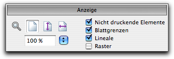 Wird hier (siehe Abb. 1.55) die Lupe ausgewählt, so kann mit Klick aufs Dokument gezoomt werden, wobei die angeklickte Stelle sicher im Fenster bleibt. Wird beim Klick aufs Dokument gleichzeitig die Taste “/• gedrückt, so wird verkleinert statt vergrößert. Mit der Lupe als Zeiger kann im Layout auch einfach über eine bestimmte Stelle ein Rechteck aufgezogen werden. Das bewirkt, dass der damit angegebene Bereich auf die ganze Fenstergröße gezoomt wird. Je kleiner also der Bereich, den Sie auswählen, desto höher wird dabei der Vergrößerungsfaktor. Die drei Schaltfelder neben der Lupe stellen den Darstellungsmaßstab auf 100% ein, bzw. passen die Seite an die Fensterhöhe oder -breite an.
