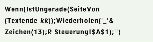 Die in Zelle A1 des Rechenblattes angegebene Zahl muss also genau so groß sein, dass mit Ihren Formatfestlegungen für Standardschrift und Standardabsatz eine Seite mit Leerabsätzen gefüllt wird. Genau genommen fügt die Formel nicht Leerabsätze ein, sondern auch noch je einen Unterstrich, damit Sie auch sehen was passiert. Da die zugeordnete Füllvorlage ja nichtdruckend ist, werden die Zeichen im Druck nicht erscheinen. Die richtige Zahl, die in Zelle A1 von «R Steuerung» gehört, ermitteln Sie erst beim Schreiben des Textes im Layout des Kapitels 1. Sobald das Textende dabei auf Seite 3 rutscht, wird die Formel die Leerabsätze anfügen. Solange das Textende noch auf der ersten Zeile steht, passen Sie die Zahl in Zelle A1 so lange an, bis die angefügten Leerabsätze genau reichen, um die zusätzliche Seite zu erzwingen.