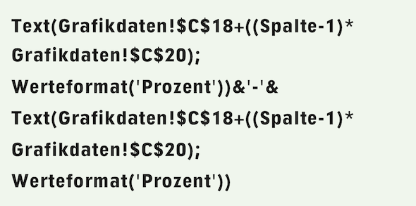 Die Differenz zwischen dem errechneten Basiswert der Skala und dem Maximum (Zelle A19) runden Sie so auf, dass die Schrittgröße ein Mehrfaches eines halben Prozentes ist. Das besorgt folgende Formel in Zelle A20: