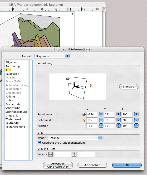 . Beide Symbole lassen sich mit dem Zeiger anfassen und verschieben. Die Kamera symbolisiert den Blickwinkel, mit der Lichtquelle sind Schattenverläufe veränderbar. Auch dieses Verschieben kann intuitiv zur richtigen Darstellung führen, besonders, wenn Sie das Fenster neben Ihrer Infografik haben und sofort sehen, wie sich die Veränderungen auswirken. Ganz exakt geschieht das mit den Zahleneingaben unter «Standpunkt», «Lichtpunkt» und «Rotation» (siehe Abb. 4.10). Wenn Sie mehrere gleichartige Diagramme erstellen müssen, können Sie sich so die Eingaben notieren, um Sie für alle übrigen Infografiken analog zu verwenden.