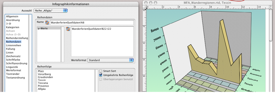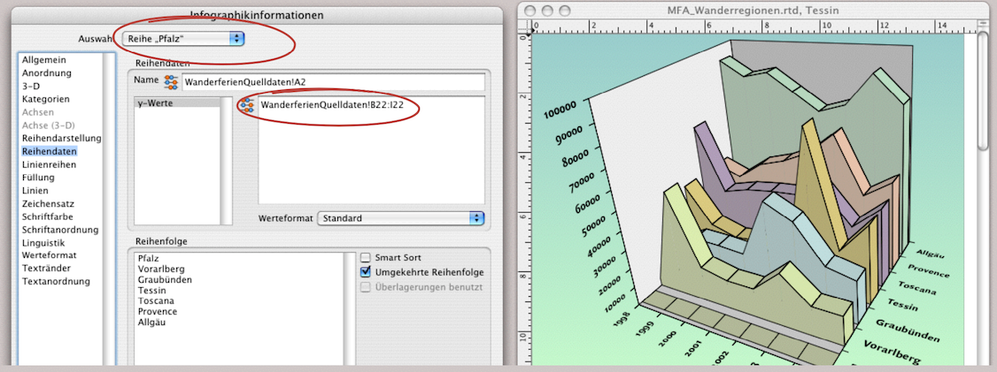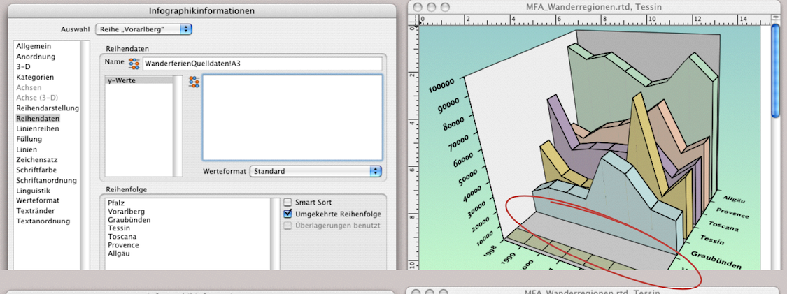 Doch Sie sehen auf einen Blick, dass diese Darstellung nicht sehr aussagekräftig ist. Die höchste Kurve verdeckt alle anderen dahinter liegenden. Sie haben nun zwei Möglichkeiten: Entweder Sie sortieren im Rechenblatt die Zeilen in umgekehrter Reihenfolge oder, wenn die Quelldaten aus triftigen Gründen nicht verschoben werden dürfen, können Sie die Reihenfolge in der Infografik verändern. Dafür rufen Sie die Tafel «Infografikinformation ➝ Reihendaten» auf (siehe Abb. 4.5). Unter «Auswahl» muss sowohl «Alle Reihen» stehen als auch «Umgekehrte Reihenfolge» mit dem Häkchen ausgewählt sein. Unter «Reihenfolge» sehen Sie alle Reihentitel. Hier können Sie auch einzeln manuell mit dem Zeiger die Titel und damit die Darstellung in der Infografik verschieben.