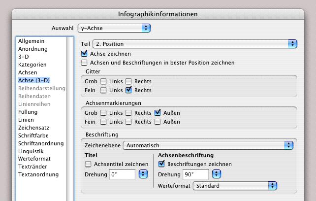 Hingegen möchten wir an der linksliegenden Wand die Werte durch Linien besser sichtbar machen. Rufen Sie wieder die «Infografikinformation» auf. Unter «y-Achse» im Einblendmenü wählen Sie unter «Teil ➝ 2. Position ➝ Achse zeichnen» aus. Darunter für das Gitter «Fein ➝ Rechts». Die übrigen Eingaben für «Achsenmarkierungen» und «Beschriftung» sind bereits gegeben (siehe Abb. 4.16). Damit ist die Infografik fertig erstellt.