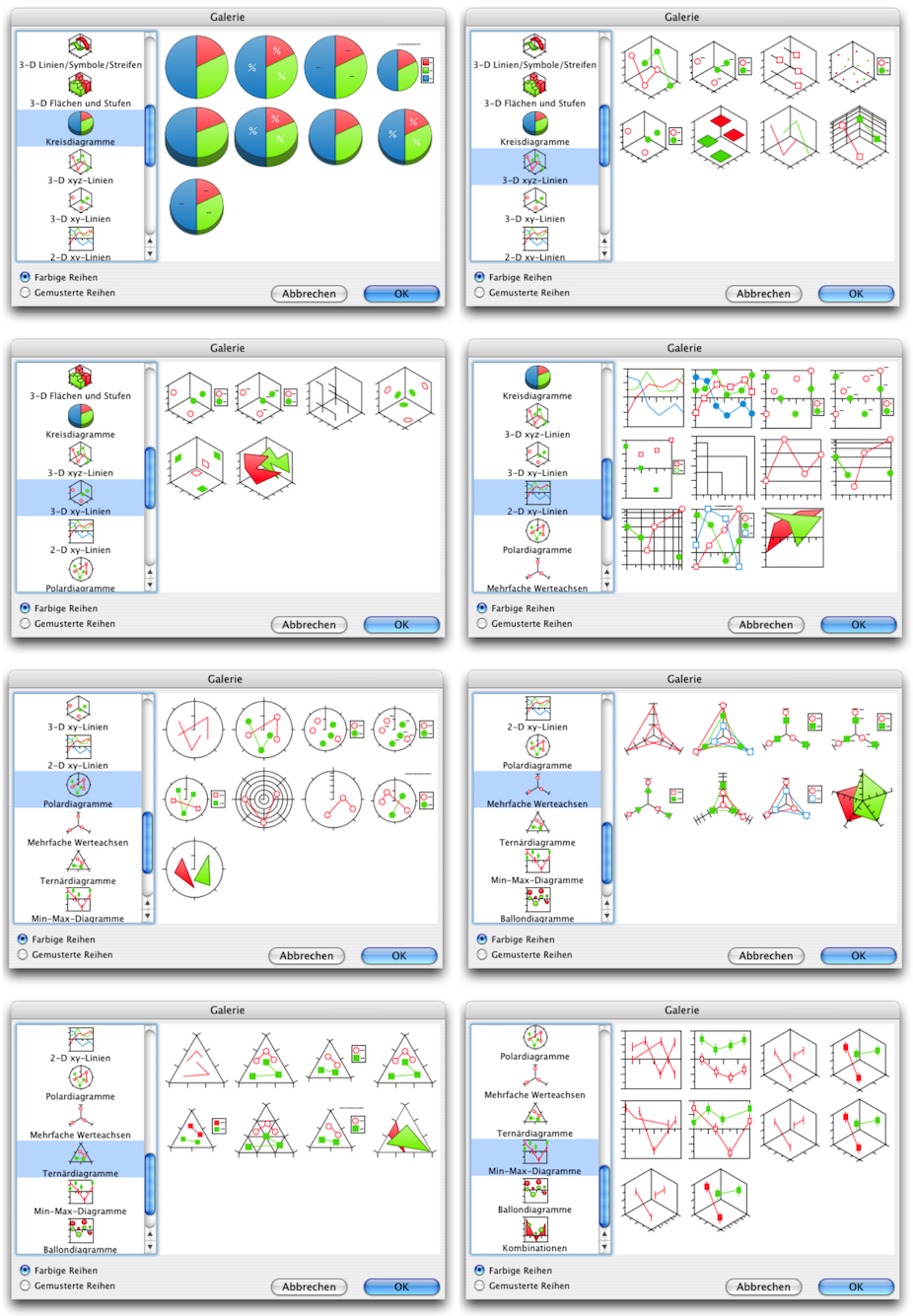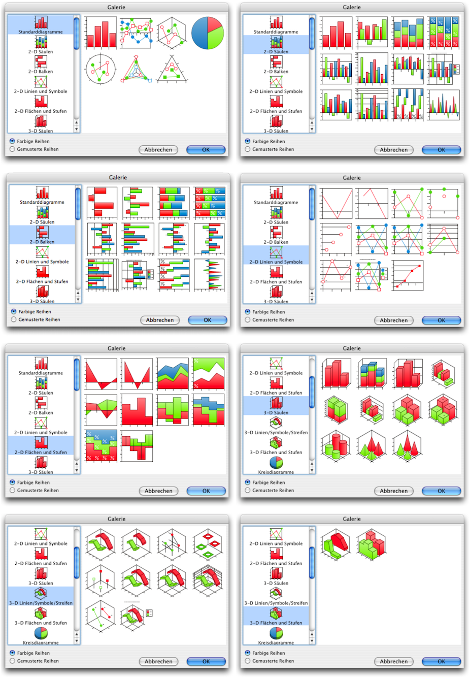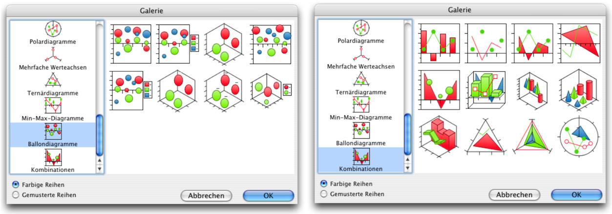 Unter Menü «Infografik ➝ Galerie» öffnet sich ein Fenster, wo Sie aus über 150 Standard-Diagrammarten auswählen können. Jede dieser Grafikarten bietet außerdem zahlreiche Möglichkeiten zur individuellen Ausgestaltung. Im Abschnitt Der berühmte Alterspilz sind die einzelnen Tafeln der Galerie abgebildet. Für die Wanderregionstatistik wurde das Flächendiagramm in 3-D ausgewählt.