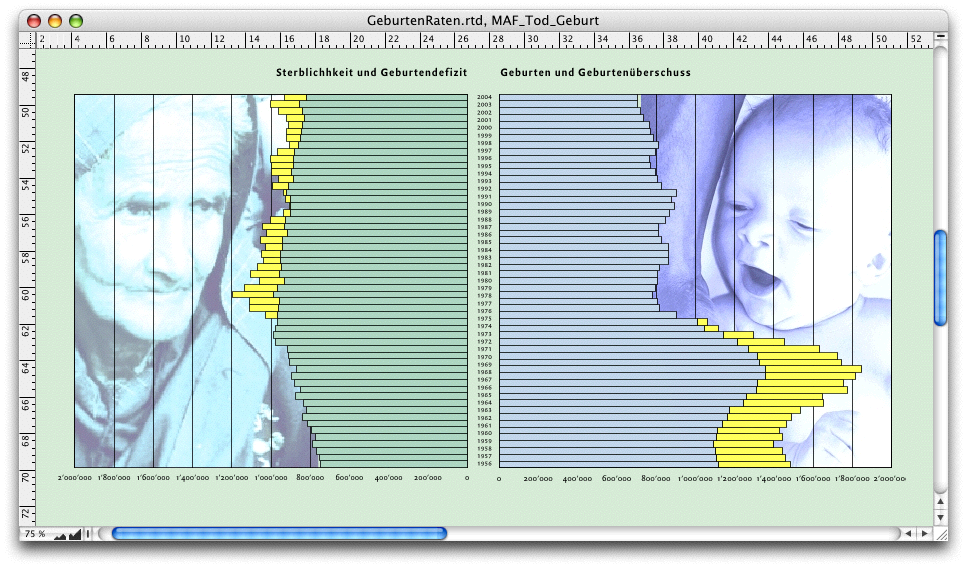 Unter «Infografik ➝ Achsen ➝ y-Achse» (Abb. 4.25 links) lassen sich die Maximal-/Minimalwerte definieren und ebenso die Weiten/Abstände der einzelnen Werte. Damit kann ein Diagramm eine deutlichere oder eine „dramatischere“ Aussage bekommen. Nach dem Motto „Traue keiner Infografik, die du nicht selbst dramatisiert hast” können Sie damit experimentieren und die Wirkungen ausprobieren. Auf jeden Fall dient Farbgebung der Verdeutlichung oder Akzentuierung. In Abb. 4.25 rechts ist die Grafik im Grunde schon fertig. Hier wurden bereits folgende Schritte verändert: Der Hintergrund hat eine transparente Füllung erhalten, der Titel wurde geschrieben (in «Titel» klicken und gewünschten Text eingeben) und die gesamte Infografik wurde mit Hilfe der Palette «Objektkoordinaten» in der Höhe leicht verzogen (Höhe 120%). Die Schrift- und Farbformatierungen sind übrigens gleich einzustellen wie in jeder anderen RagTime-Komponente. Damit der Unterschied zwischen Geburtenüberschuss und Geburtendefizit deutlich wird, sind für die Reihen ab 1972 aufwärts die Farben geändert worden. Jeder Klick in eine Reihe wählt automatisch die gesamte „Spalte“ aus. Es lassen sich aber auch einzelne Reihe auswählen, um einzeln Farben zuordnen zu können (mit einem verzögerten Doppelklick). Die einfache Visualisierung der Sterbe- und Geburtenraten sowie des Defizit/Überschusses ist damit erfüllt (Abb. 4.25 rechts).