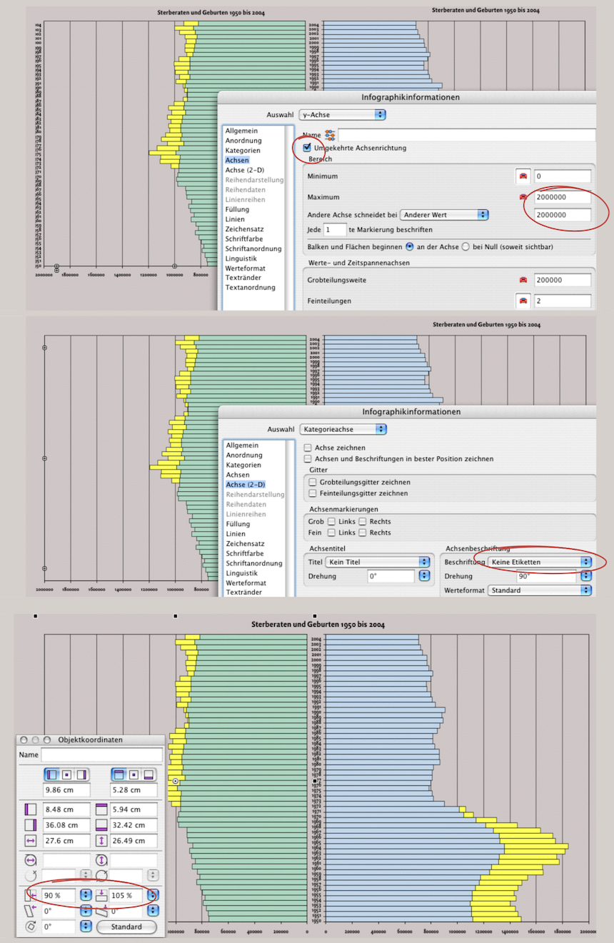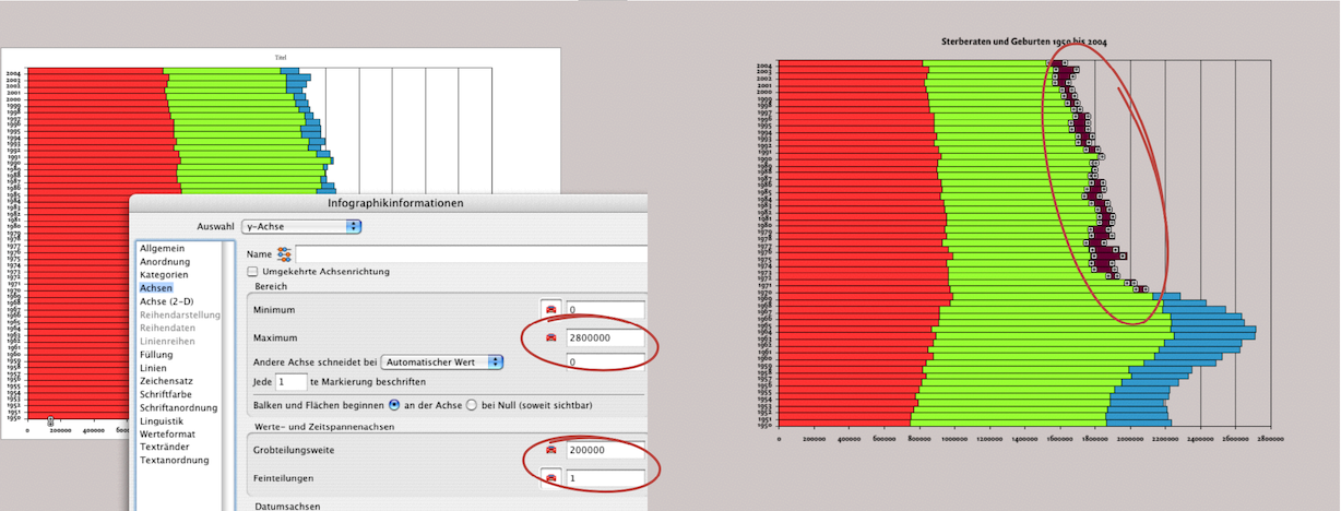 Rufen Sie «Infografikinformationen ➝ Achsen ➝ y-Achse» auf. Hier ist «Umgekehrte Achsenrichtung» mit einem Häkchen auszuwählen. Damit laufen die Reihen sowie die Beschriftung von rechts nach links (siehe Abb. 4.27 oben). Auf der gleichen Tafel setzen wir das Maximum für die y-Anzeige auf 2 Millionen und die Grobteilungsweite auf 200 000. Diese Änderung hätten wir schon vor dem Duplizieren der Grafik vornehmen können, doch manchmal sieht man erst im Nachhinein, dass die leeren Räume zu groß wirken.