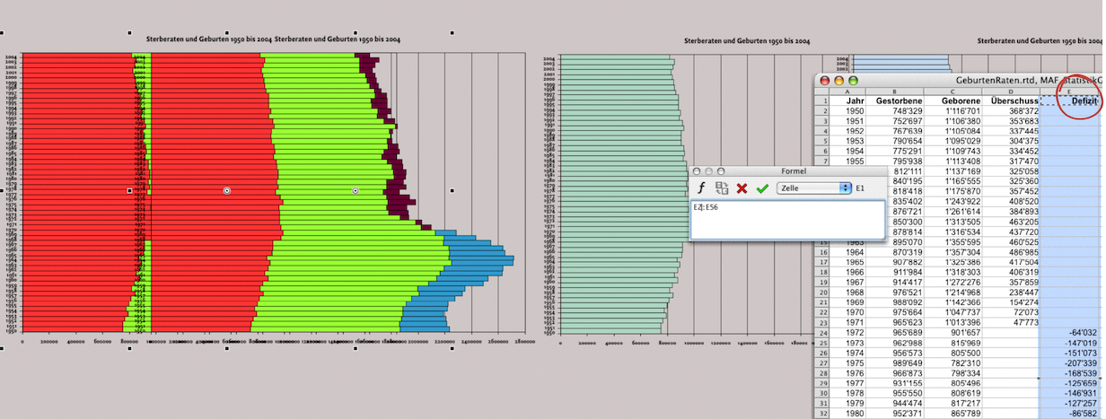 Wir möchten die Informationsteile noch klarer auseinander nehmen. Dazu duplizieren Sie die soeben fertig gestellte Infografik: Die Grafik auswählen und mit gedrückter Wahltaste die Maus ziehen (Abb. 4.26 links). Damit wird eine völlig identische Grafik erstellt und die Referenzen zum Rechenblatt bleiben erhalten bzw. werden mit übernommen. Nun trennen Sie im Rechenblatt die Spalte D in zwei Spalten. In der neuen Spalte E stehen nur die Geburtendefizite, in der Spalte E verbleiben nur die Geburtenüberschüsse (Abb. 4.26 rechts). In der zuerst erstellten Grafik wird nun die Spalte D nur mit den Geburtenüberschüssen angezeigt. Diese erste Grafik wird damit zur „Geburtengrafik“. Darum löschen Sie darin folglich die Reihen der Sterberaten: Auswählen und Ausschneiden. Analog soll die kopierte Grafik zur „Sterbegrafik“ werden. Dort löschen Sie sowohl die Reihen der Geburtenraten wie auch diejenigen der Geburtenüberschüsse. Dafür wählen Sie im Rechenblatt Ihre neu angelegte Spalte E mit den Geburtendefiziten aus und kopieren Sie ein. In Abb. 4.26 rechts ist das Einsetzen dieser Spalte noch nicht vollzogen, dafür wurden in den Reihen bereits die Füllvorlagen geändert. Damit die beiden Grafiken sich auch wirklich gegenüberstehen, sind die Achsen der „Sterbegrafik“ zu tauschen und deren Kategoriewerte unsichtbar zu machen. Auch die y-Achse ist noch zu ändern.