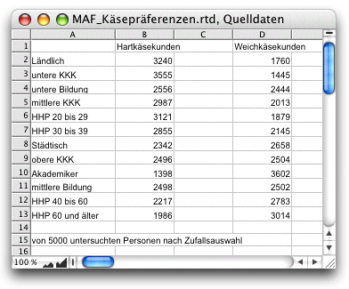 Beim MFA-Institut wurden Erhebungen über die Präferenzen von Weichkäse und Hartkäse gemacht. Um das unterschiedliche Profil deutlich zumachen, eignet sich das Mehrachsendiagramm wie in Abb. 4.28. Aufgrund der Farbtransparenzen, die in RagTime möglich sind, lassen sich die Überlagerungen um so besser darstellen. So wird im Beispieldiagramm auf einen Blick deutlich, dass Weichkäse eher städtisch, eher in den unteren Kaufkraftklassen (KKK) und eher von mittleren bis älteren haushaltführenden Personen (HHP) bevorzugt gekauft wird. Die Quelldaten aus dem Rechenblatt (siehe Abb. 4.29) sind einfach. Aber auch die Erstellung des Diagramms ist relativ unkompliziert.
