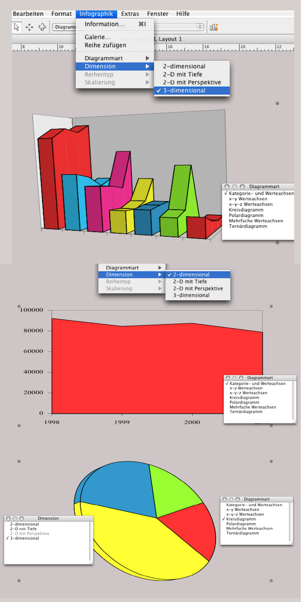 Wie bei allen anderen RagTime-Komponenten können Sie auch bei der Komponente Infografik entweder mit klaren Vorstellungen systematisch Ihre Infografik aufbauen oder intuitiv vorgehen, ausprobieren und nachträglich wieder verändern. In Abb. 4.3 ist jeweils der gleiche Dateninhalt mit anderen Diagrammarten umgesetzt. Unter «Infografik ➝ Diagrammart» und «Infografik ➝ Dimension» befinden sich zwei Abreißmenüs, mit denen Sie nachträglich Ihre Infografik in eine andere Darstellungsart verändern können. Die einzelnen Darstellungsarten sind nicht für alle Daten gleich gut geeignet. Es lohnt sich, auszuprobieren und sich dann auf eigene Standards festzulegen.